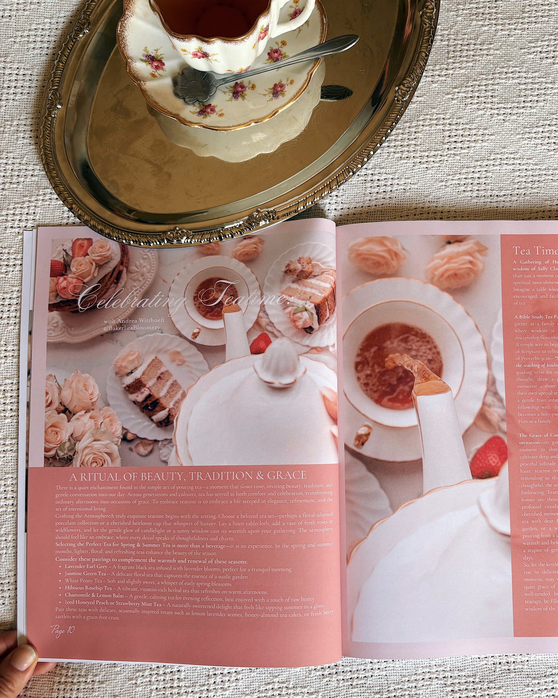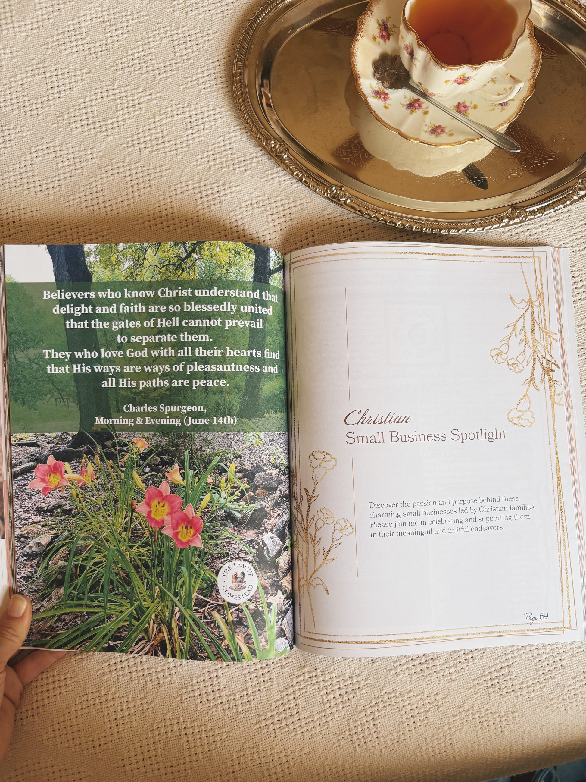 Celebrate Teatime with Andrea Witthoeft, learn how to nurture your home, create smooth homeschooling rhythms, and learn about the legacy of Quilting Bees in American Homesteading. This edition features a 25-page long Spotlight on different Christian Small Businesses! Curate your dream home on a budget, learn to pray with your children, and read about gardening insights from The Little House on the Prairie series — and SO much more!